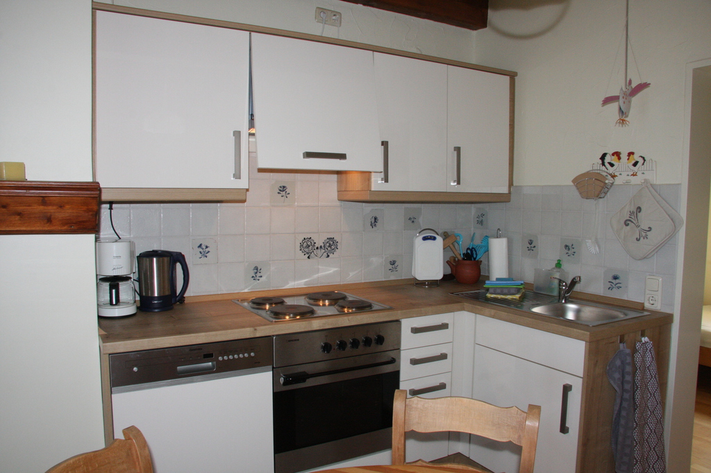 Die Küche ist ausgestattet mit Herd, Backofen, Spülmaschine und weiteren nützlichen Kleingeräten wie Wasserkocher, Kaffeemaschine, etc..