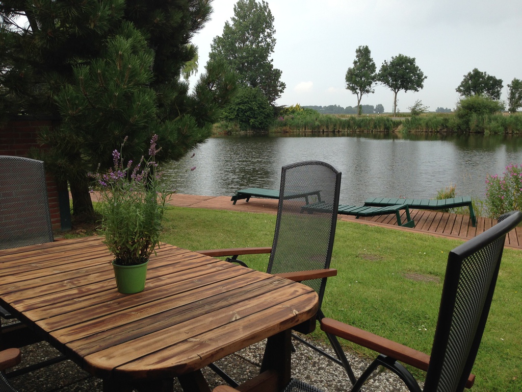 Eine eigene Terrasse mit direktem Zugang zum Kolk ist ebenso vorhanden. Die Terrasse ist mit Gartenmöbeln (Tisch, Stühle, Liegen, Grill) ausgestattet.